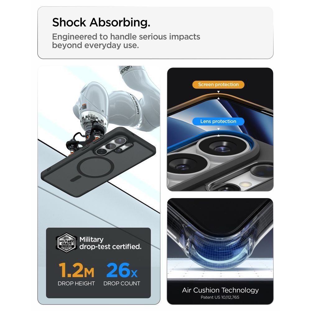 Telefono dėklas Galaxy S26 Ultra hibridinis (TPU+PC) suteikia efektyvią apsaugą nesluošiant telefono dizaino — kieta nugarėlė kartu su lankstesne rėmine dalimi amortizuoja smūgius. Dėl sustiprintų kampų su oro pagalvėlėmis ir pakeltų briaunų ekrano ir kameros paviršiai mažiau liečia lygius paviršius. Spigen įrengė magnetinį žiedą, suderinamą su MagSafe įkrovimu.