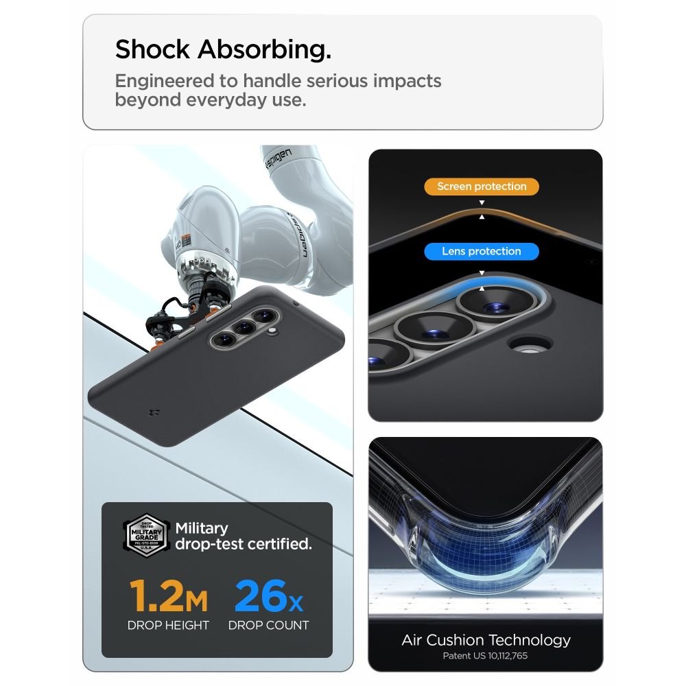 Telefono dėklas Samsung Galaxy S26, MagSafe suderinamas — sukurtas apsaugoti telefoną nedidinant jo apimties ir užtikrinti patogų belaidį krovimą. Dėklas pagamintas iš TPU medžiagos, turi matinį paviršių, todėl gerai laikosi rankoje ir sumažina pirštų atspaudų kiekį. Sustiprinti kampai ir vidinis amortizacinis raštas padeda sumažinti smūgių poveikį kritimo atveju; gamintojas Spigen integravo MagSafe žiedą patogiam prijungimui prie priedų.