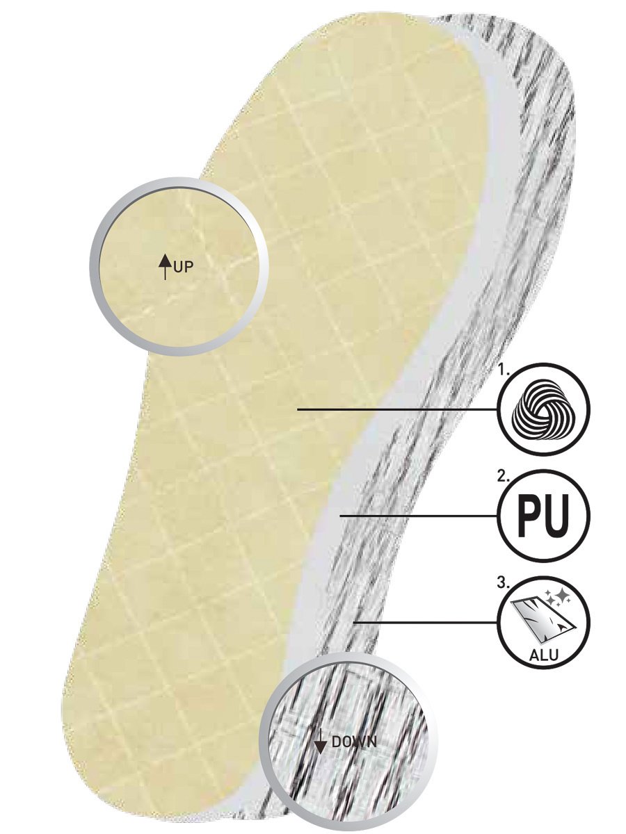 - Aliuminio folija atspindi šilumą atgal į batą, išlaikydama ją viduje