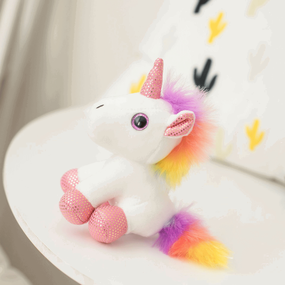 Žavus vienaragio formos raktų pakabukas iš baltos pliušinės medžiagos suteiks pasakos dvelksmo jūsų kuprinei, rankinei ar raktams. Kompaktiškas, minkštas ir spalvingas aksesuaras tinka tiek vaikams, tiek suaugusiesiems, ieškantiems išskirtinių detalių.