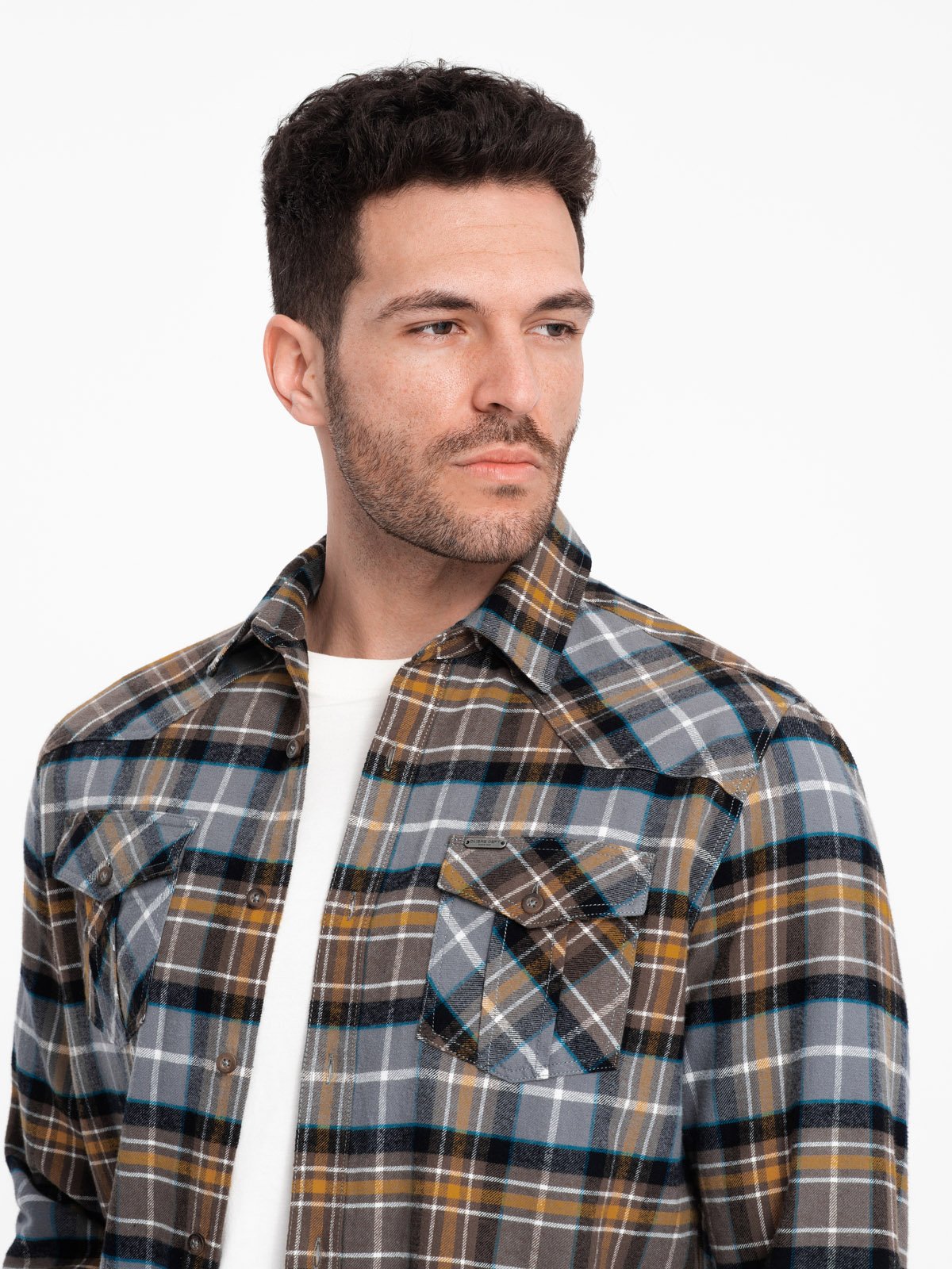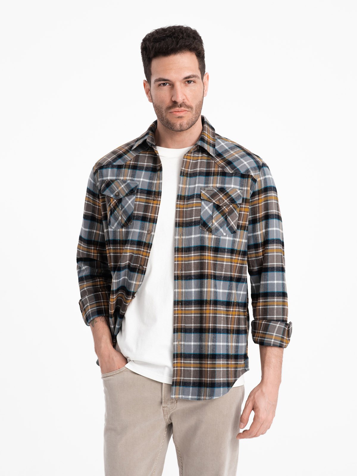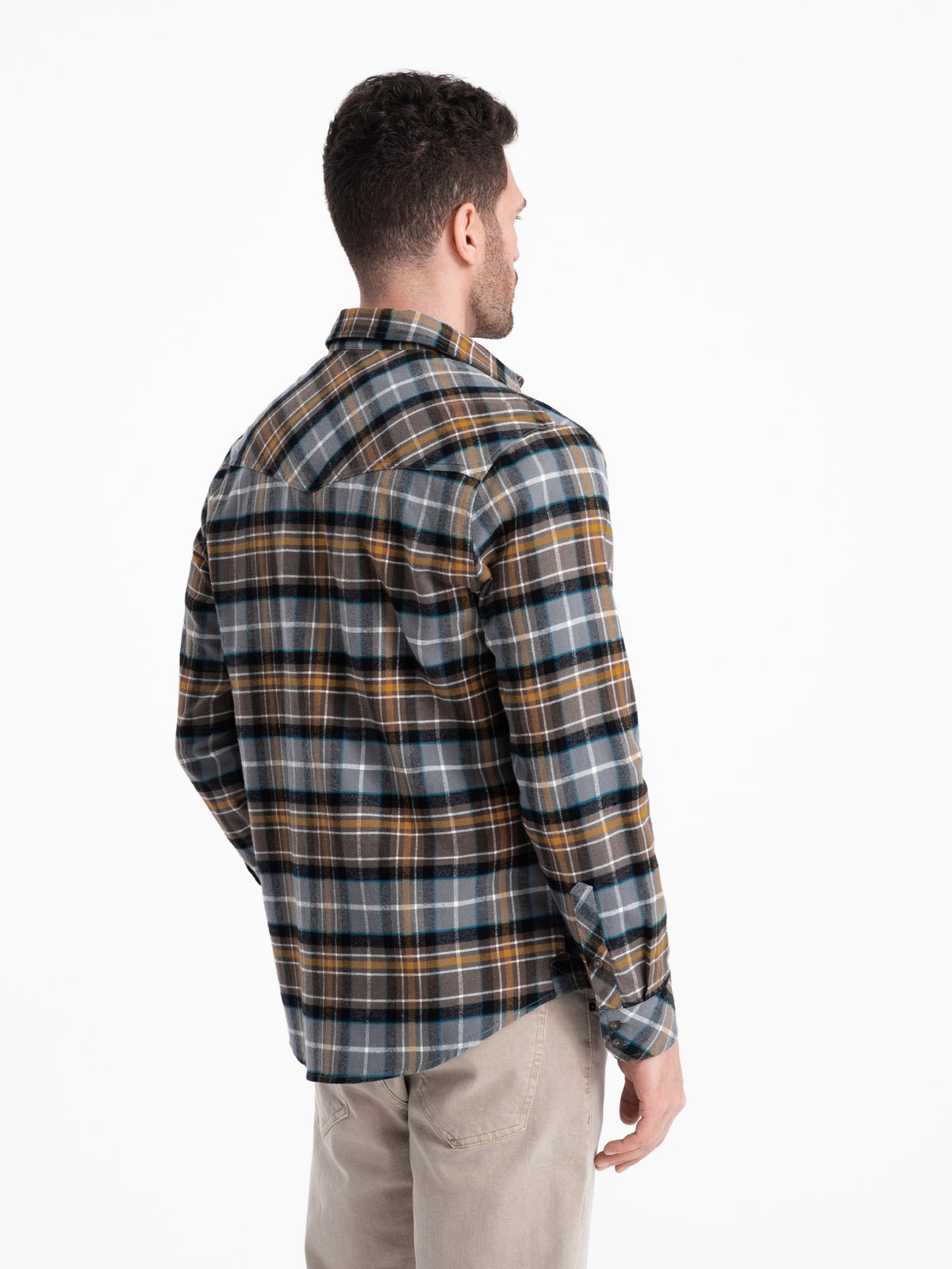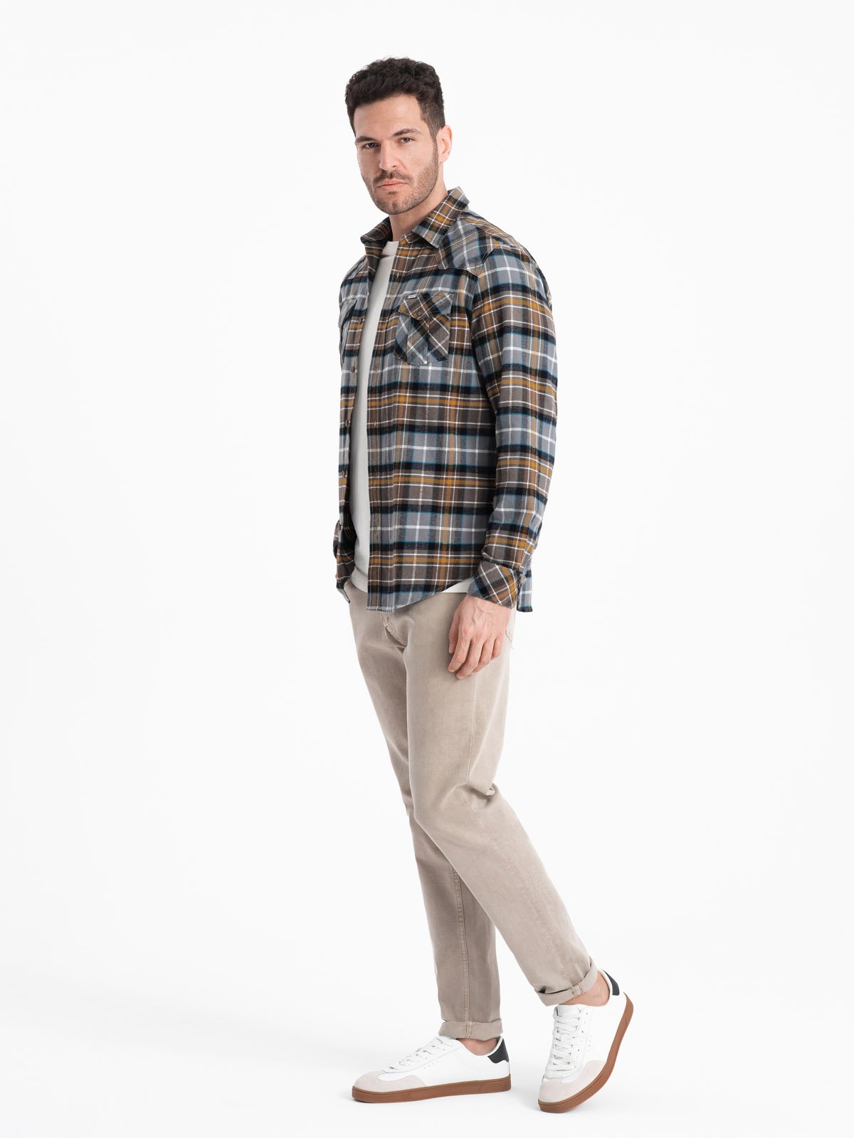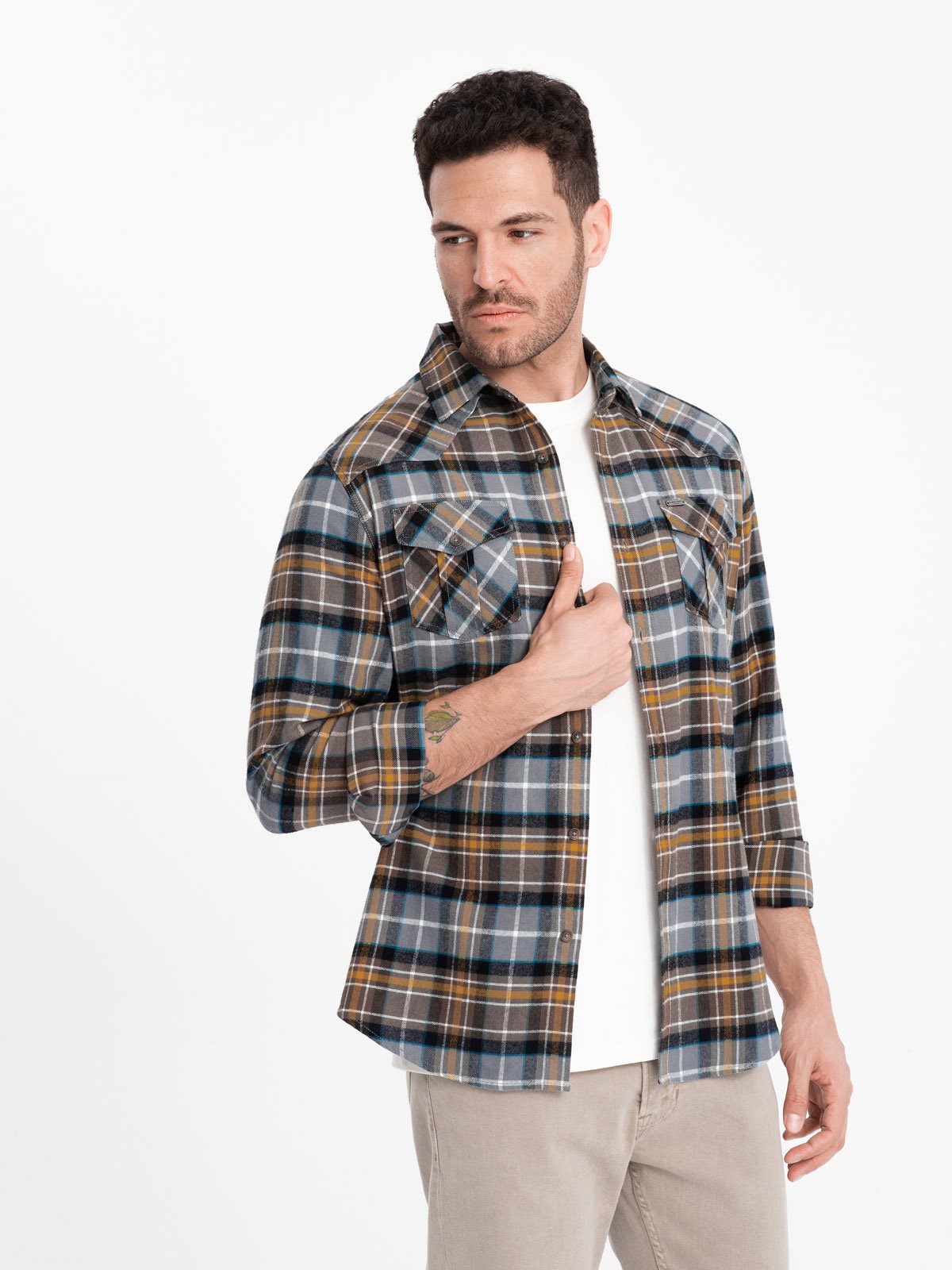 Vyriški languoti flaneliniai marškiniai su kišenėmis - pilkai geltoni